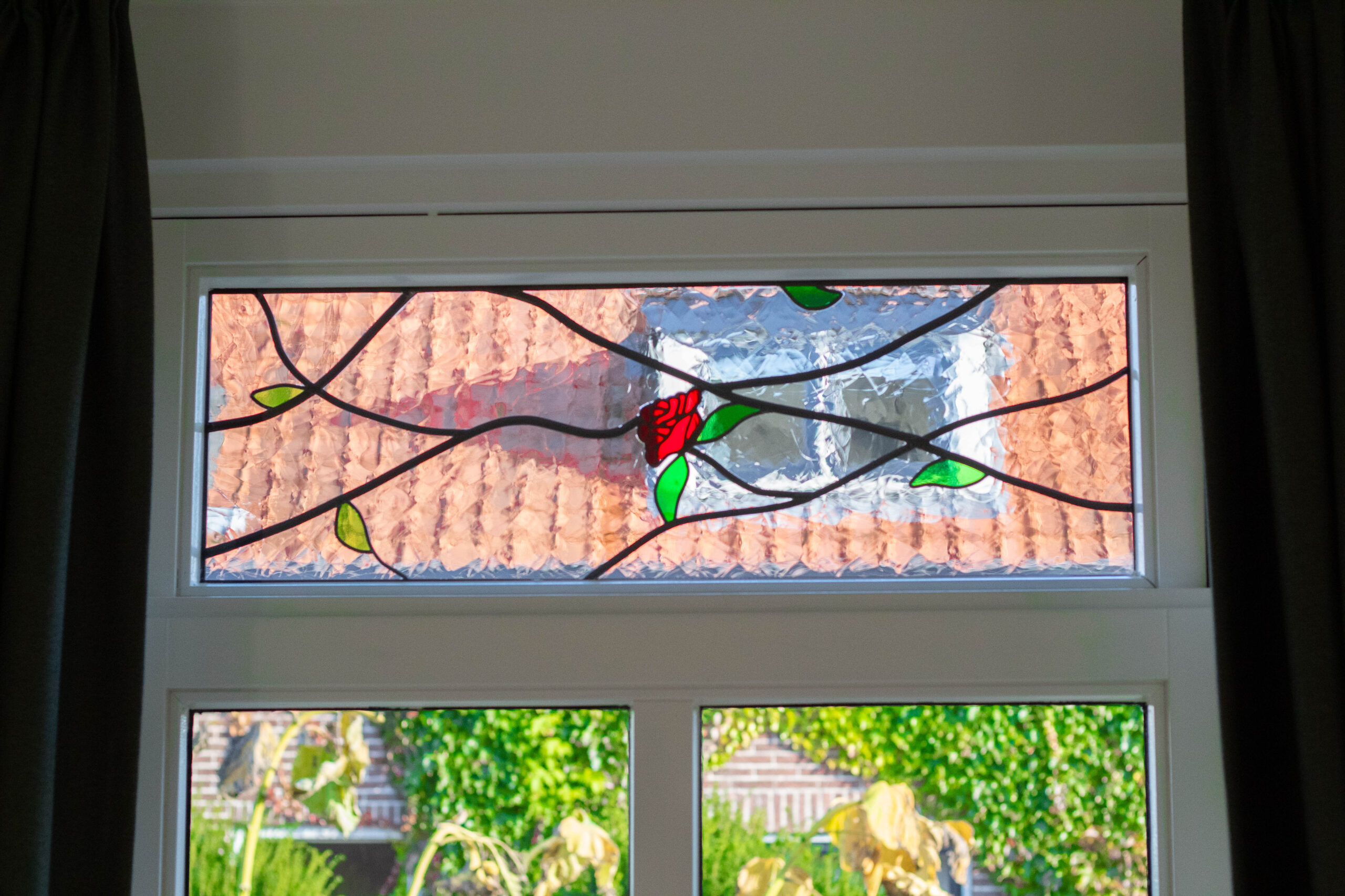 In deze woning heeft het Glas in Lood een verhaal. De rozenstruik start bij de voordeur met een bijtje en een honinggraat. Op de andere ramen groeit de rozenstruik door tot in het laatste raampje boven in de nok van het huis. En eindigt met weer een bijtje en honiggraat.